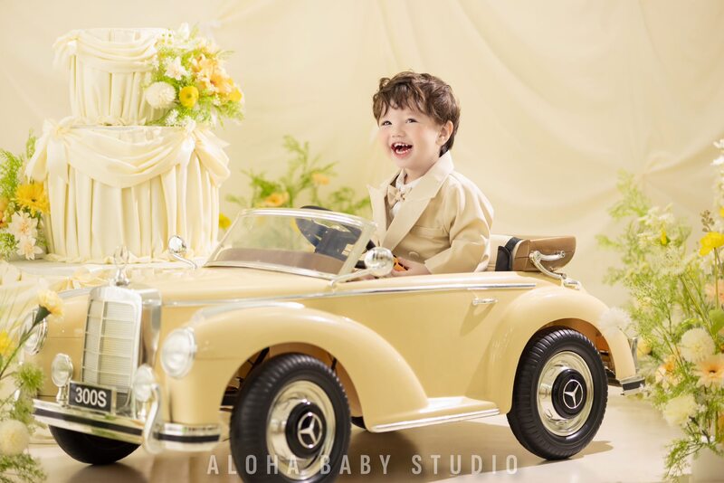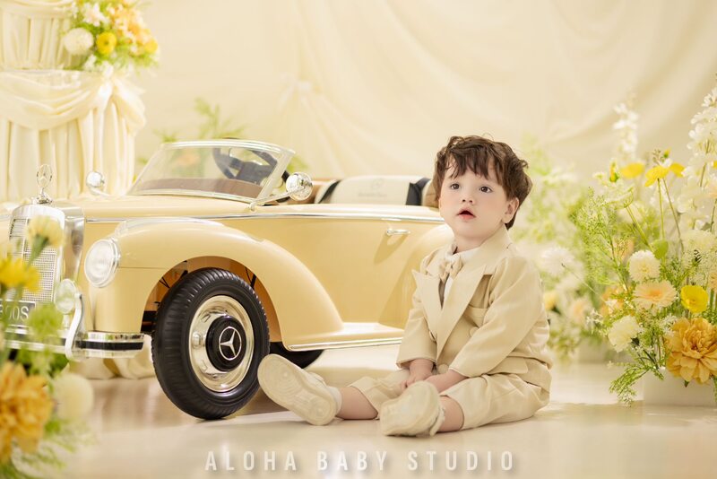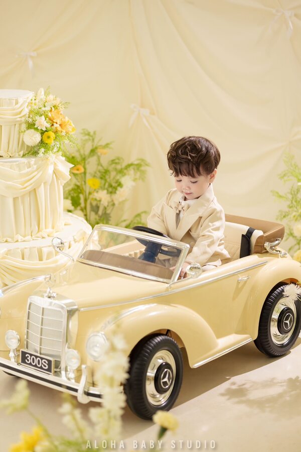 Chiếc xe màu kem, bánh lái nhỏ vừa tay và mình là Cá – một em bé đang cười to vì thấy thế giới bỗng rộng lớn đến lạ.